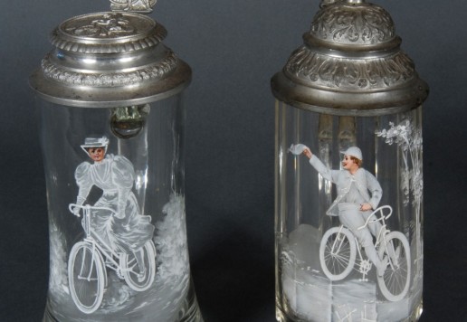 2 decorative glass tankards with bicycle motif