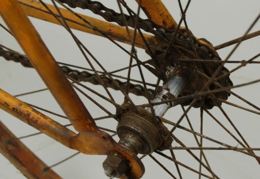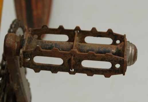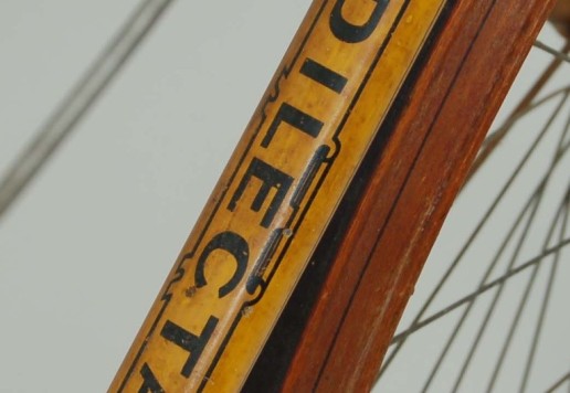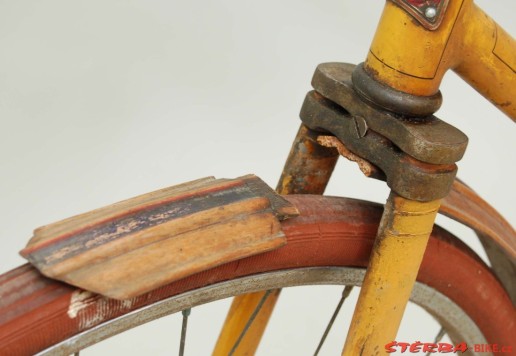 Kolo je doplněno dřevěnými plochými blatníky s černo-červeným linkováním. Přední potřebuje malou opravu, jak je vidět na fotografiích, zadní je lehce poškozen po obou stranách, ale drží vcelku.