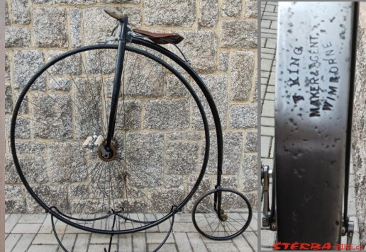 Anglické vysoké kolo F. King Wimborne s 51“ předním kolem. Velmi kompletní stroj s dutým rámem – kostí. Originální díly, včetně gripů, repliky pedálů a brzdy. Sedlo má nově vyrobenou kůži. Na sedlové pružině je velmi jasné jméno výrobce. Originální a ihned pojízdný stroj.