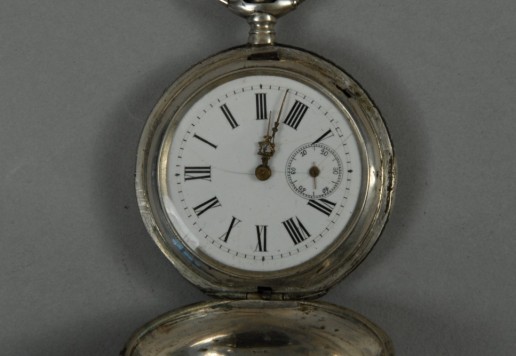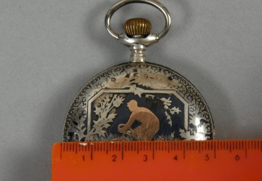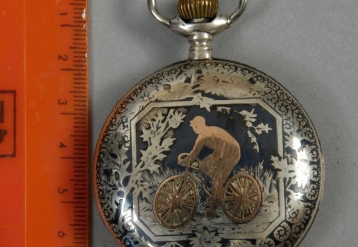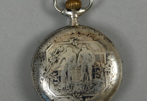 Wall clock with two motifs. On one side solo rider, on reverse side pair of riders on safety bicycles (motif approx. 1895)