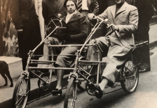 Extremely rare Vélostable recumbent tandem made in Neuilly sur Seine (Paris) in the mid-1930s. These bikes were available (same as Velocar) with either handlebar or steering wheel. Designed for long distance cyclotouring, with full lighting, fenders, carriers, Cyclo rear derailleur, drum brake.