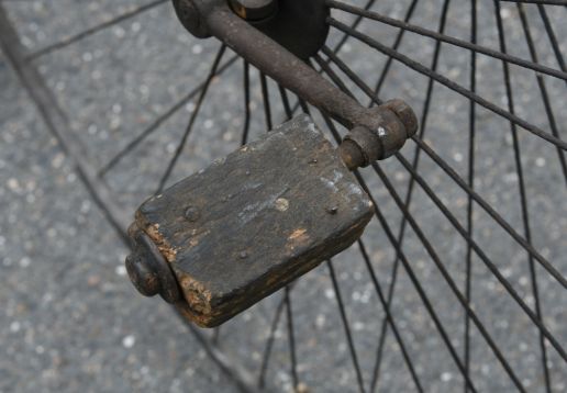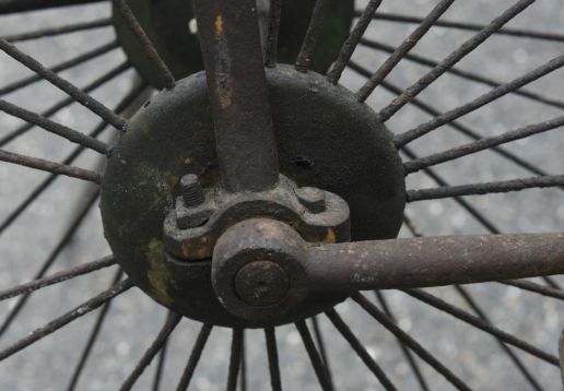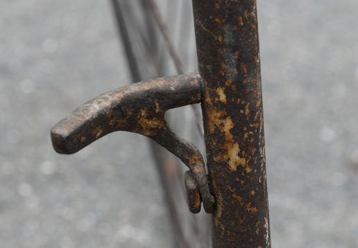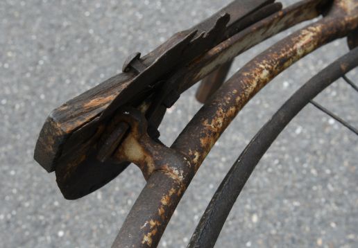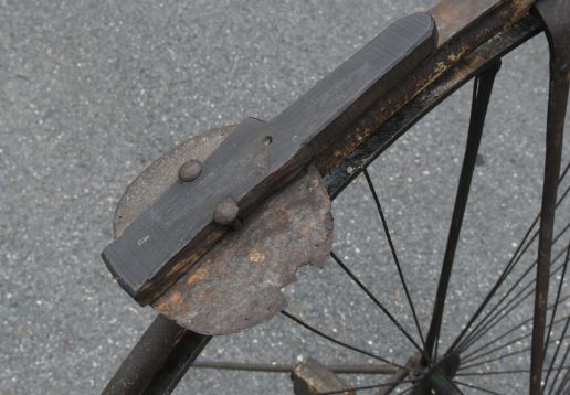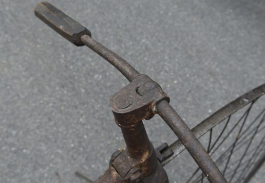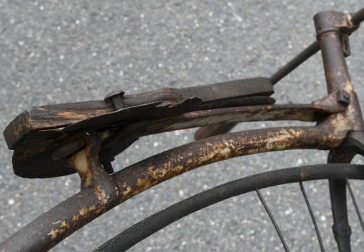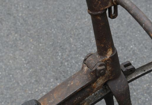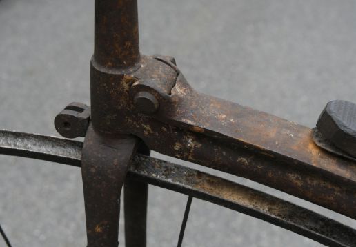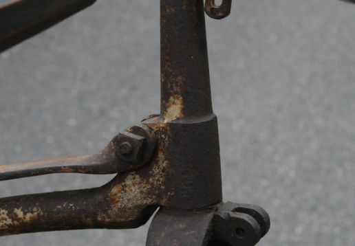 Projek k renovaci. Zajímavá přední brzda přitlačována otočnými řidítka jako u velocipedů.
